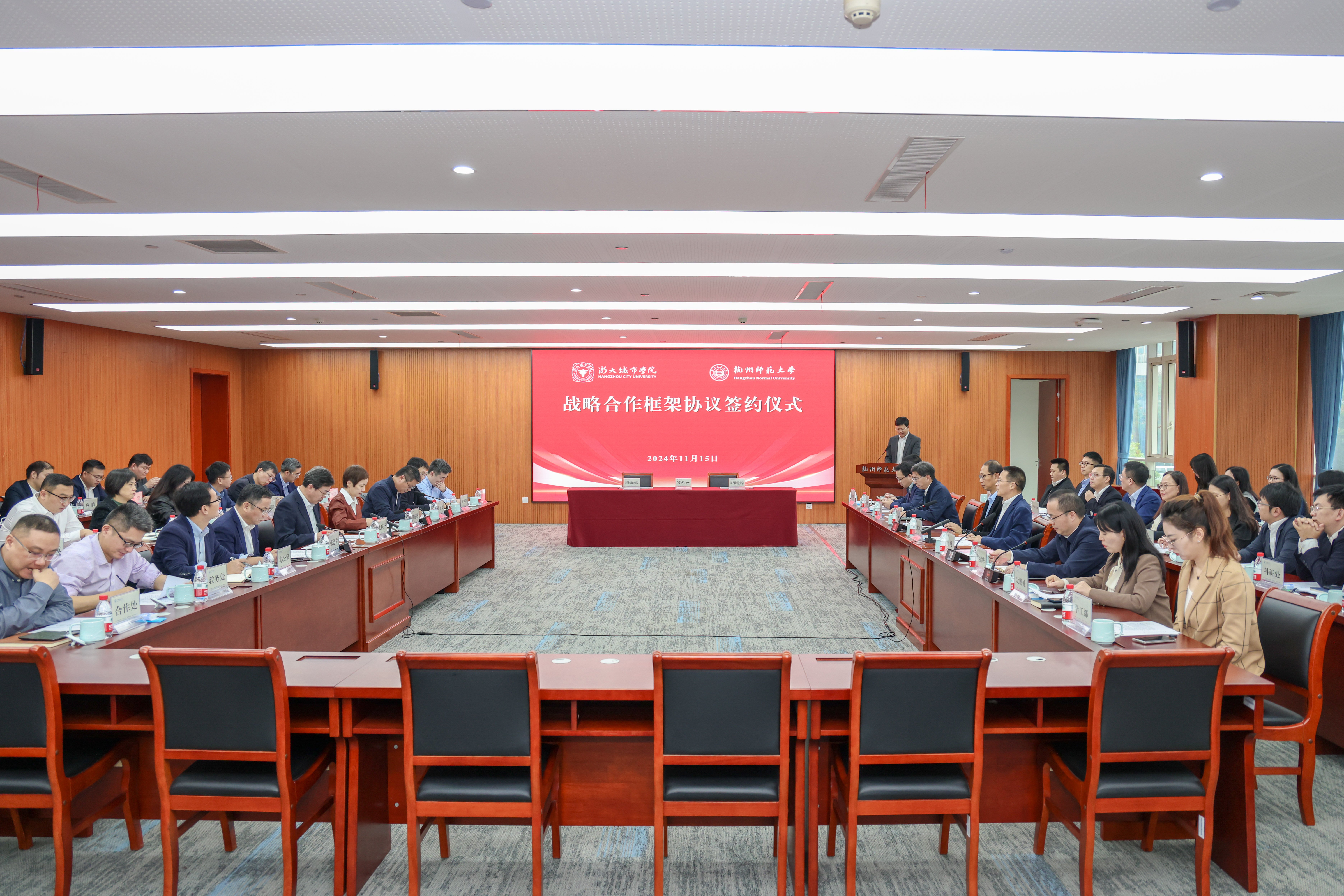 会上还宣读了两校选派挂职干部文件。双方将互派干部进行挂职交流,通过互派互学互享,共绘“杭城”发展同心圆。我校工程学院学术副院长齐欢和杭州师范大学教务处邱璐分别作为挂职干部代表发言,他们表示,将在新的岗位上充分发挥自身特长和优势,虚心学习请教、认真履行职责、主动担当作为,为两校的事业发展多流一些汗、多出一份力、多作一些贡献。