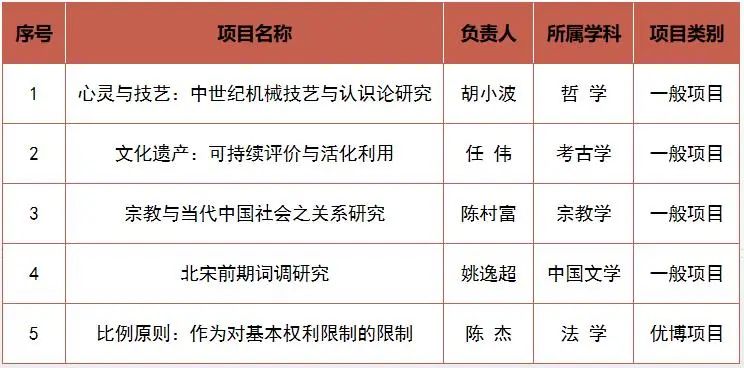 11月29日,全国哲学社会科学工作办公室公示了2022年国家社科基金后期资助暨优秀博士论文出版项目立项名单。学校今年共申报12个项目,有5个项目获立项,分别来自哲学、考古学、宗教学、中国文学和法学等5个学科,立项率达41.67%,其中一般项目4项、优秀博士论文出版项目1项。